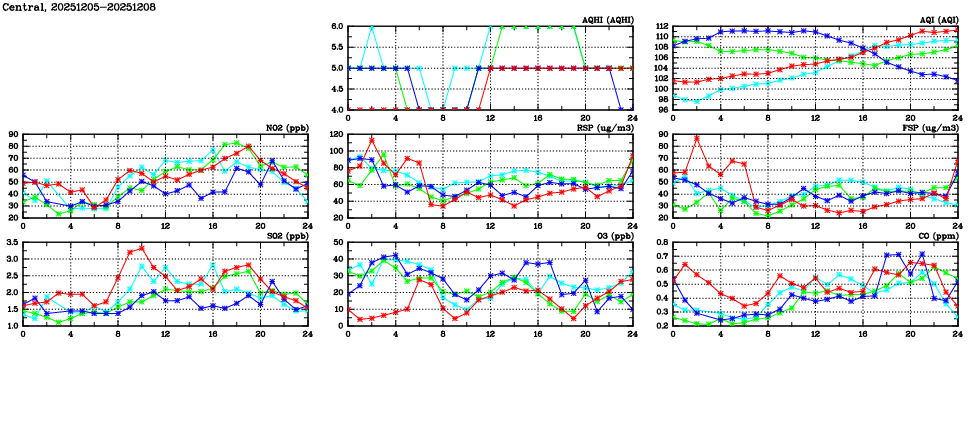 | Air Quality Data Time Series in Central (2025/12/08) | ( Line colors: Day -3 Day -2 Day -1 Current day ) | 2D Map Current AQHI |