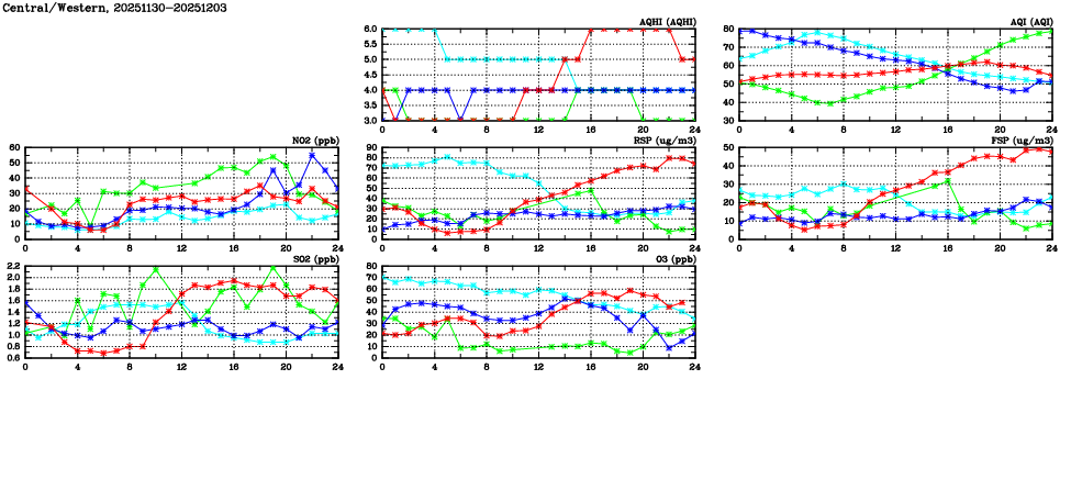 | Air Quality Data Time Series in Central/Western (2025/12/03) | ( Line colors: Day -3 Day -2 Day -1 Current day ) | 2D Map Current AQHI |