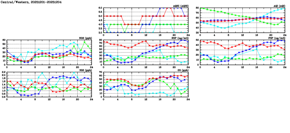 | Air Quality Data Time Series in Central/Western (2025/12/04) | ( Line colors: Day -3 Day -2 Day -1 Current day ) | 2D Map Current AQHI |