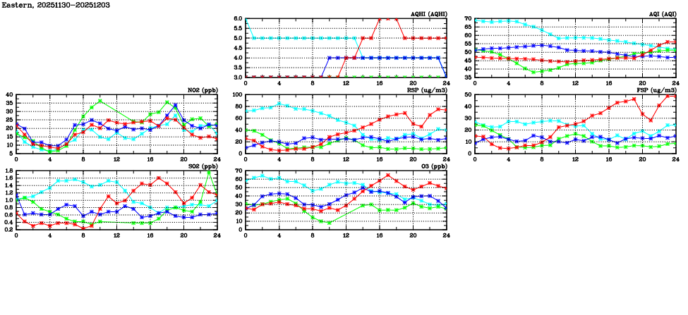 | Air Quality Data Time Series in Eastern (2025/12/03) | ( Line colors: Day -3 Day -2 Day -1 Current day ) | 2D Map Current AQHI |