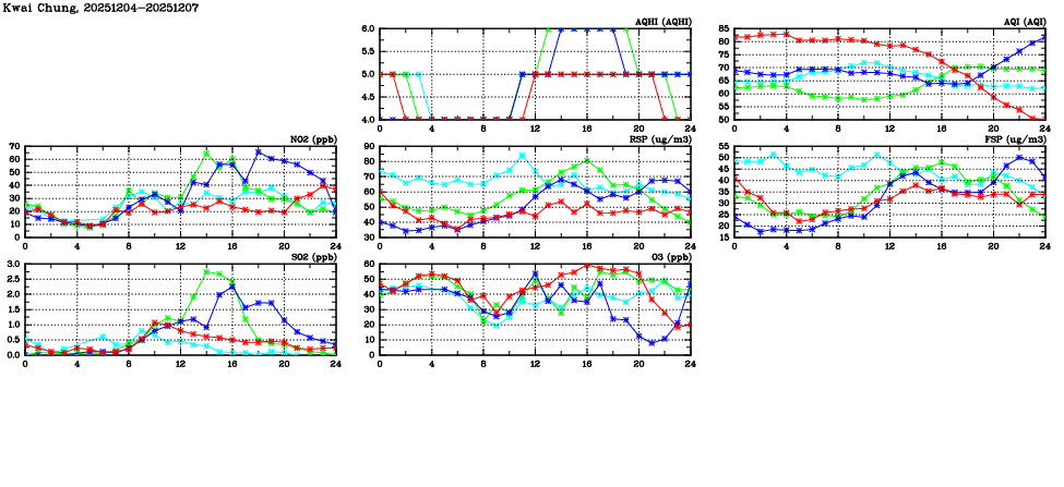 | Air Quality Data Time Series in Kwai Chung (2025/12/07) | ( Line colors: Day -3 Day -2 Day -1 Current day ) | 2D Map Current AQHI |