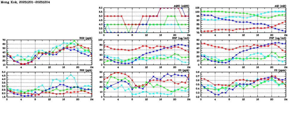 | Air Quality Data Time Series in Mong Kok (2025/12/04) | ( Line colors: Day -3 Day -2 Day -1 Current day ) | 2D Map Current AQHI |
