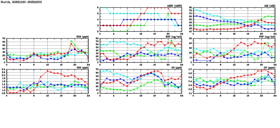 | Air Quality Data Time Series in North (2025/12/03) | ( Line colors: Day -3 Day -2 Day -1 Current day ) | 2D Map Current AQHI |