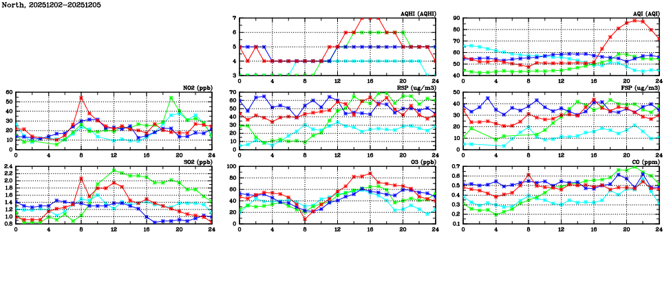 | Air Quality Data Time Series in North (2025/12/05) | ( Line colors: Day -3 Day -2 Day -1 Current day ) | 2D Map Current AQHI |