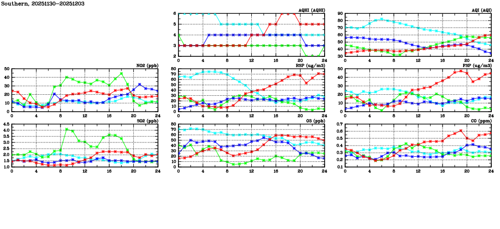 | Air Quality Data Time Series in Southern (2025/12/03) | ( Line colors: Day -3 Day -2 Day -1 Current day ) | 2D Map Current AQHI |