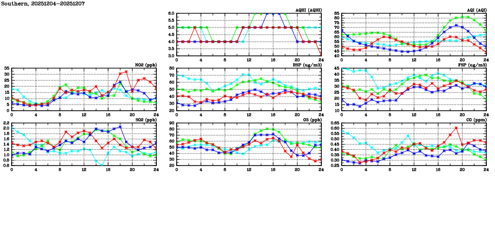 | Air Quality Data Time Series in Southern (2025/12/07) | ( Line colors: Day -3 Day -2 Day -1 Current day ) | 2D Map Current AQHI |