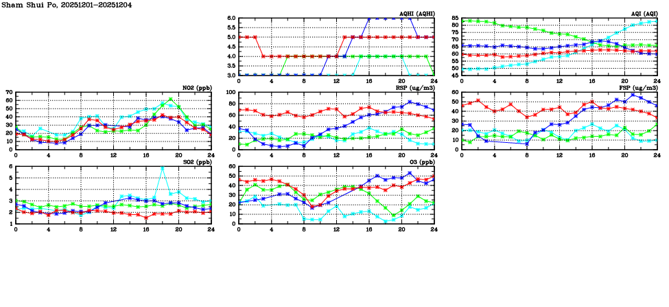 | Air Quality Data Time Series in Sham Shui Po (2025/12/04) | ( Line colors: Day -3 Day -2 Day -1 Current day ) | 2D Map Current AQHI |