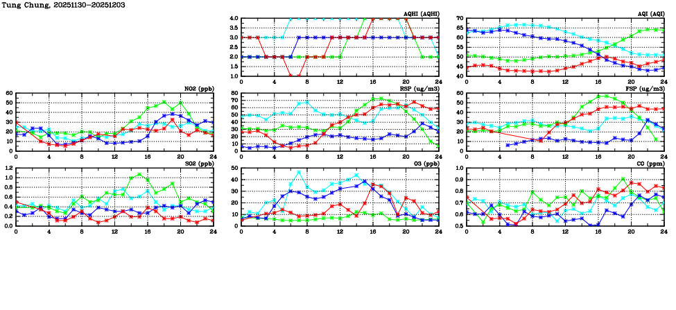 | Air Quality Data Time Series in Tung Chung (2025/12/03) | ( Line colors: Day -3 Day -2 Day -1 Current day ) | 2D Map Current AQHI |