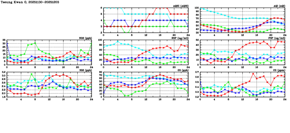 | Air Quality Data Time Series in Tseung Kwan O (2025/12/03) | ( Line colors: Day -3 Day -2 Day -1 Current day ) | 2D Map Current AQHI |