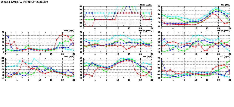 | Air Quality Data Time Series in Tseung Kwan O (2025/12/08) | ( Line colors: Day -3 Day -2 Day -1 Current day ) | 2D Map Current AQHI |