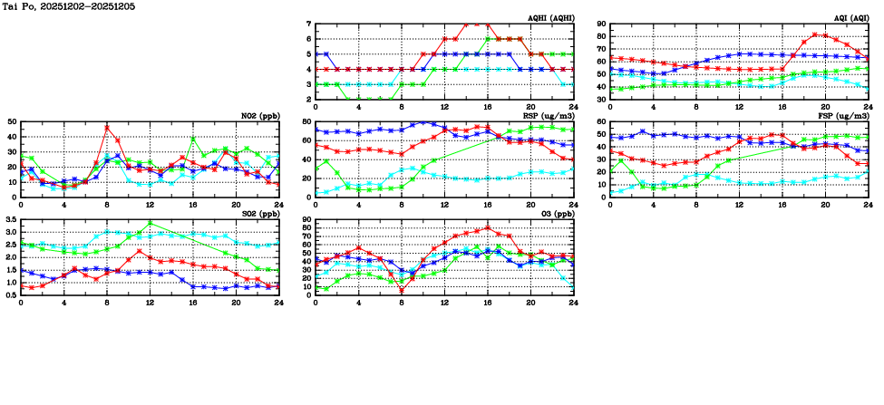 | Air Quality Data Time Series in Tai Po (2025/12/05) | ( Line colors: Day -3 Day -2 Day -1 Current day ) | 2D Map Current AQHI |