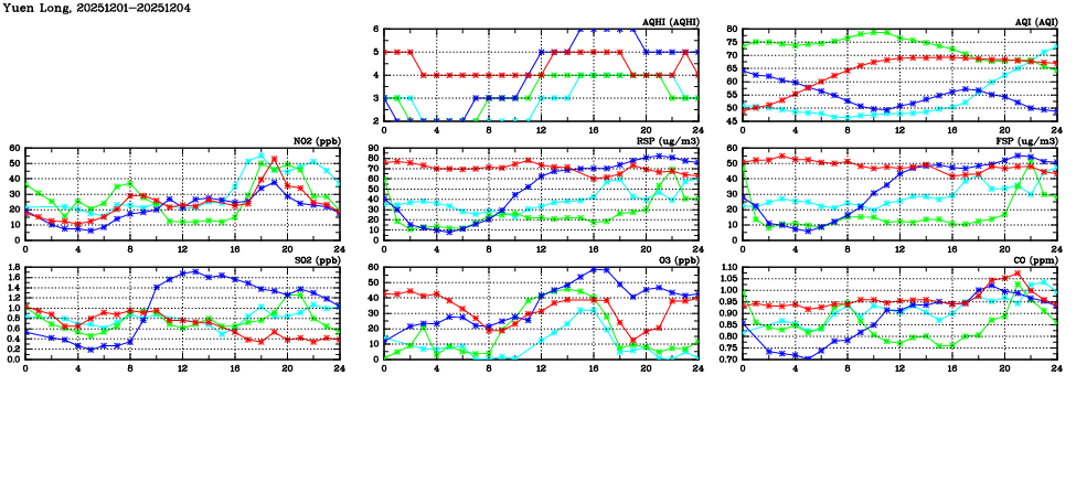 | Air Quality Data Time Series in Yuen Long (2025/12/04) | ( Line colors: Day -3 Day -2 Day -1 Current day ) | 2D Map Current AQHI |