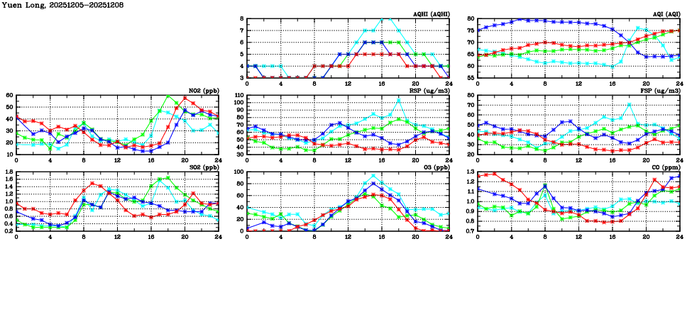 | Air Quality Data Time Series in Yuen Long (2025/12/08) | ( Line colors: Day -3 Day -2 Day -1 Current day ) | 2D Map Current AQHI |
