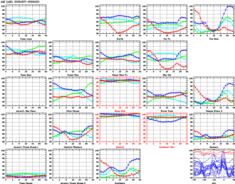 | Air Quality Data Time Series for AQI (2025/12/10) | ( Line colors: Day -3 Day -2 Day -1 Current day ) | 2D Map Current AQHI |