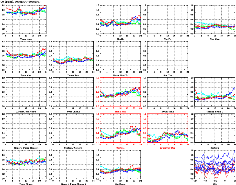 | Air Quality Data Time Series for CO (2025/12/07) | ( Line colors: Day -3 Day -2 Day -1 Current day ) | 2D Map Current AQHI |