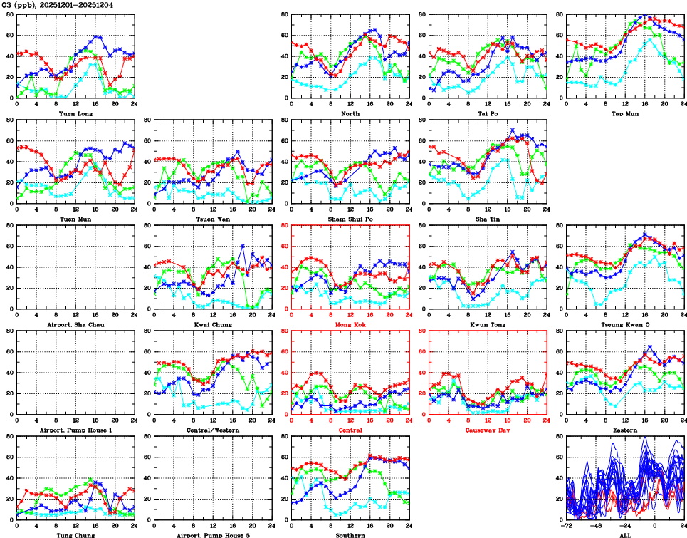 | Air Quality Data Time Series for O3 (2025/12/04) | ( Line colors: Day -3 Day -2 Day -1 Current day ) | 2D Map Current AQHI |