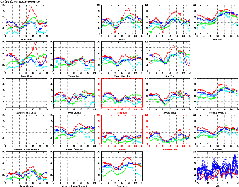 | Air Quality Data Time Series for O3 (2025/12/05) | ( Line colors: Day -3 Day -2 Day -1 Current day ) | 2D Map Current AQHI |