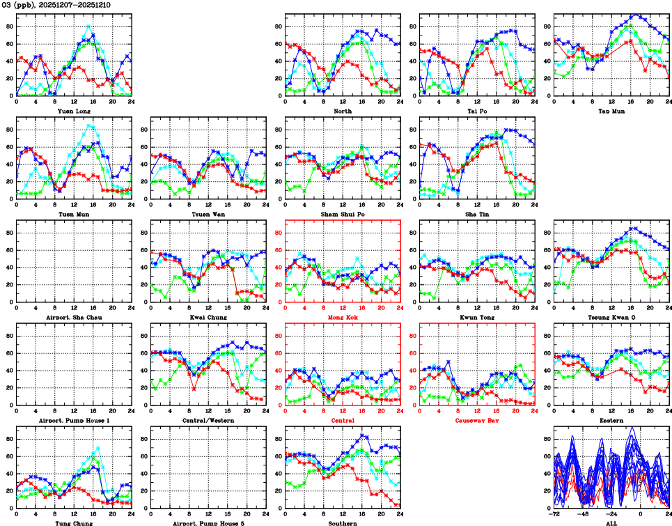 | Air Quality Data Time Series for O3 (2025/12/10) | ( Line colors: Day -3 Day -2 Day -1 Current day ) | 2D Map Current AQHI |