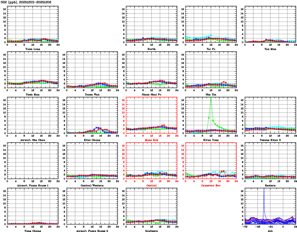 | Air Quality Data Time Series for SO2 (2025/12/06) | ( Line colors: Day -3 Day -2 Day -1 Current day ) | 2D Map Current AQHI |