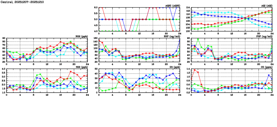 | Air Quality Data Time Series in Central (2025/12/10) | ( Line colors: Day -3 Day -2 Day -1 Current day ) | 2D Map Current AQHI |