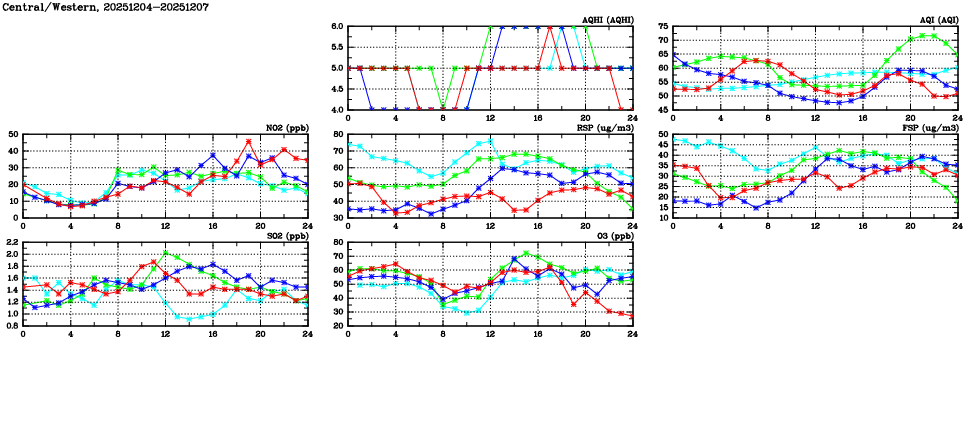 | Air Quality Data Time Series in Central/Western (2025/12/07) | ( Line colors: Day -3 Day -2 Day -1 Current day ) | 2D Map Current AQHI |