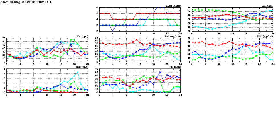 | Air Quality Data Time Series in Kwai Chung (2025/12/04) | ( Line colors: Day -3 Day -2 Day -1 Current day ) | 2D Map Current AQHI |