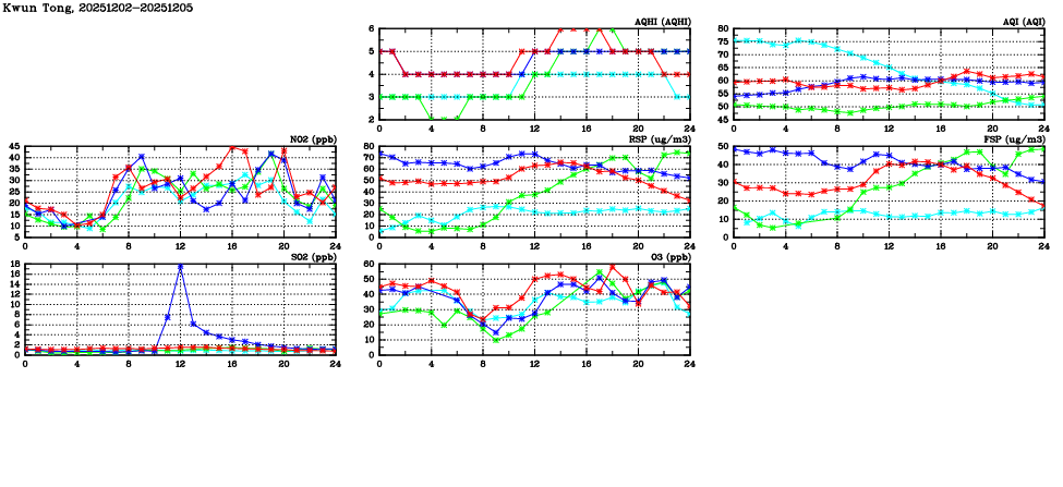 | Air Quality Data Time Series in Kwun Tong (2025/12/05) | ( Line colors: Day -3 Day -2 Day -1 Current day ) | 2D Map Current AQHI |
