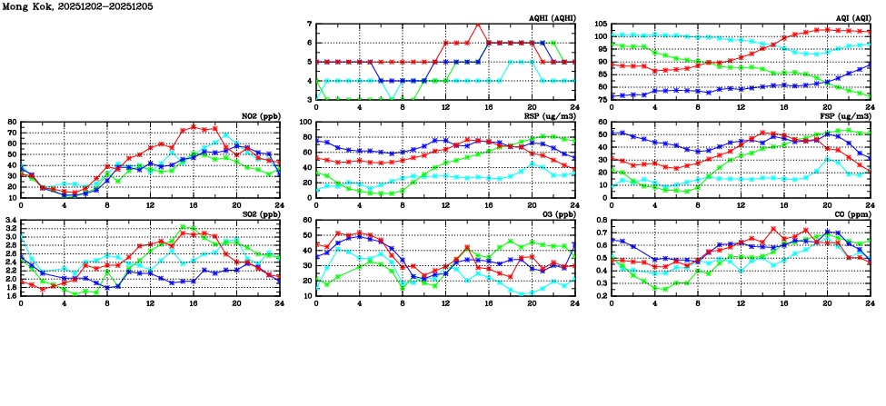 | Air Quality Data Time Series in Mong Kok (2025/12/05) | ( Line colors: Day -3 Day -2 Day -1 Current day ) | 2D Map Current AQHI |