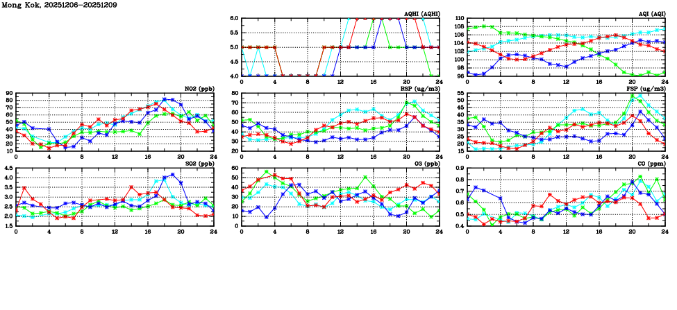 | Air Quality Data Time Series in Mong Kok (2025/12/09) | ( Line colors: Day -3 Day -2 Day -1 Current day ) | 2D Map Current AQHI |
