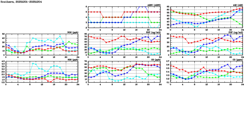 | Air Quality Data Time Series in Southern (2025/12/04) | ( Line colors: Day -3 Day -2 Day -1 Current day ) | 2D Map Current AQHI |
