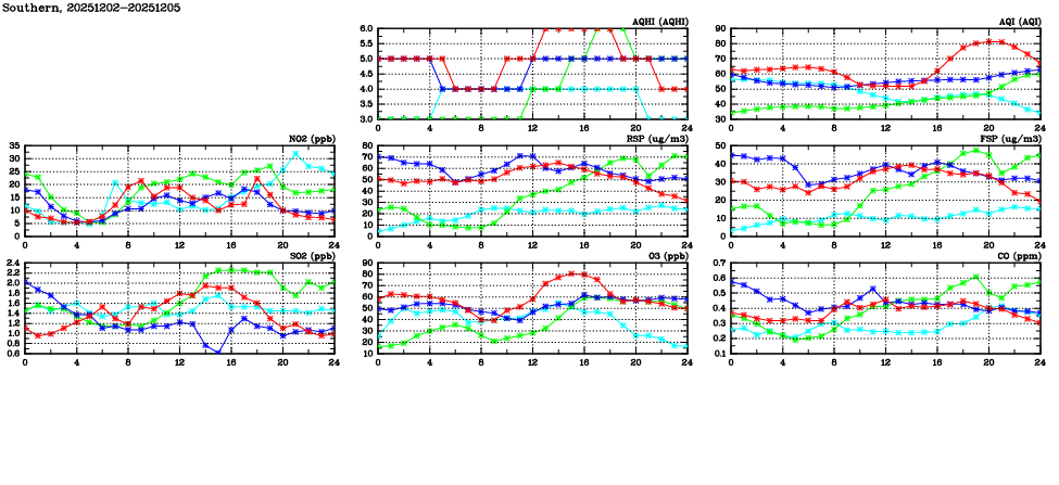| Air Quality Data Time Series in Southern (2025/12/05) | ( Line colors: Day -3 Day -2 Day -1 Current day ) | 2D Map Current AQHI |