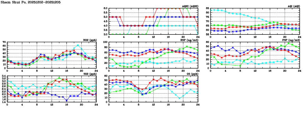 | Air Quality Data Time Series in Sham Shui Po (2025/12/05) | ( Line colors: Day -3 Day -2 Day -1 Current day ) | 2D Map Current AQHI |