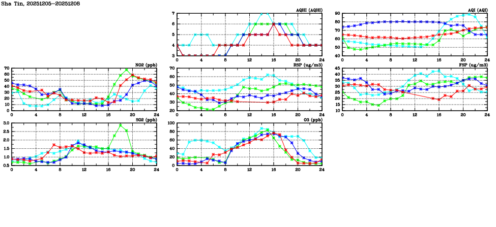 | Air Quality Data Time Series in Sha Tin (2025/12/08) | ( Line colors: Day -3 Day -2 Day -1 Current day ) | 2D Map Current AQHI |