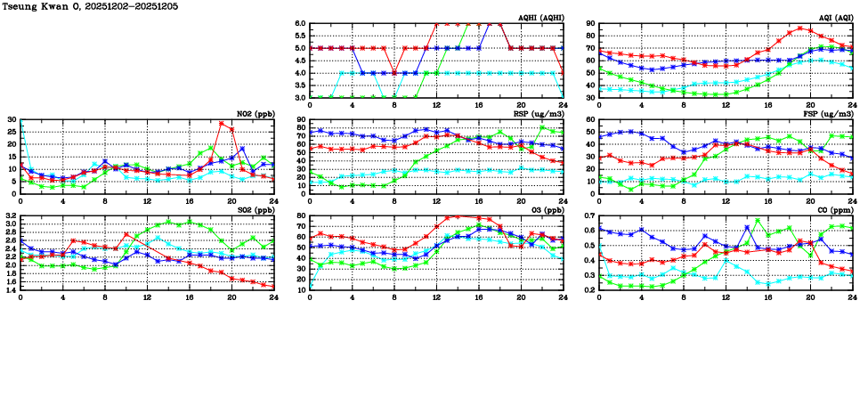 | Air Quality Data Time Series in Tseung Kwan O (2025/12/05) | ( Line colors: Day -3 Day -2 Day -1 Current day ) | 2D Map Current AQHI |