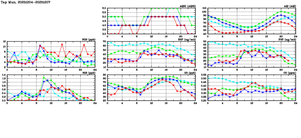 | Air Quality Data Time Series in Tap Mun (2025/12/07) | ( Line colors: Day -3 Day -2 Day -1 Current day ) | 2D Map Current AQHI |