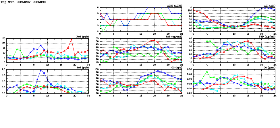 | Air Quality Data Time Series in Tap Mun (2025/12/10) | ( Line colors: Day -3 Day -2 Day -1 Current day ) | 2D Map Current AQHI |