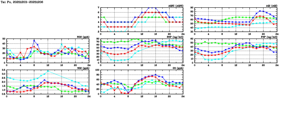| Air Quality Data Time Series in Tai Po (2025/12/06) | ( Line colors: Day -3 Day -2 Day -1 Current day ) | 2D Map Current AQHI |