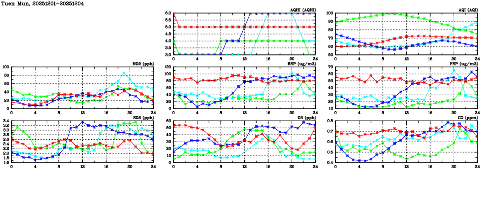 | Parameters: | AQHI | AQI | RSP | FSP | NO2 | SO2 | O3 | CO | Temp | WS | WD |