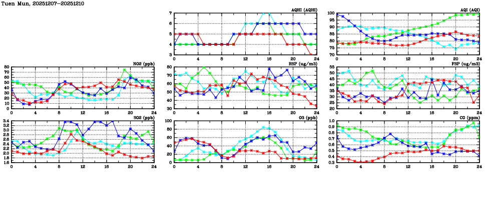 | Air Quality Data Time Series in Tuen Mun (2025/12/10) | ( Line colors: Day -3 Day -2 Day -1 Current day ) | 2D Map Current AQHI |