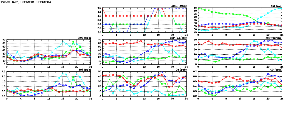 | Air Quality Data Time Series in Tsuen Wan (2025/12/04) | ( Line colors: Day -3 Day -2 Day -1 Current day ) | 2D Map Current AQHI |
