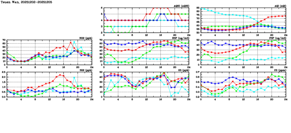 | Air Quality Data Time Series in Tsuen Wan (2025/12/05) | ( Line colors: Day -3 Day -2 Day -1 Current day ) | 2D Map Current AQHI |