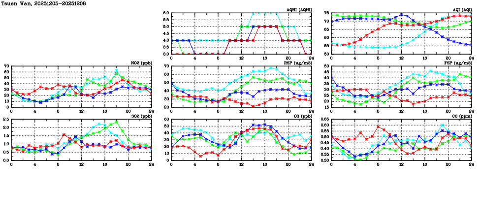| Air Quality Data Time Series in Tsuen Wan (2025/12/08) | ( Line colors: Day -3 Day -2 Day -1 Current day ) | 2D Map Current AQHI |