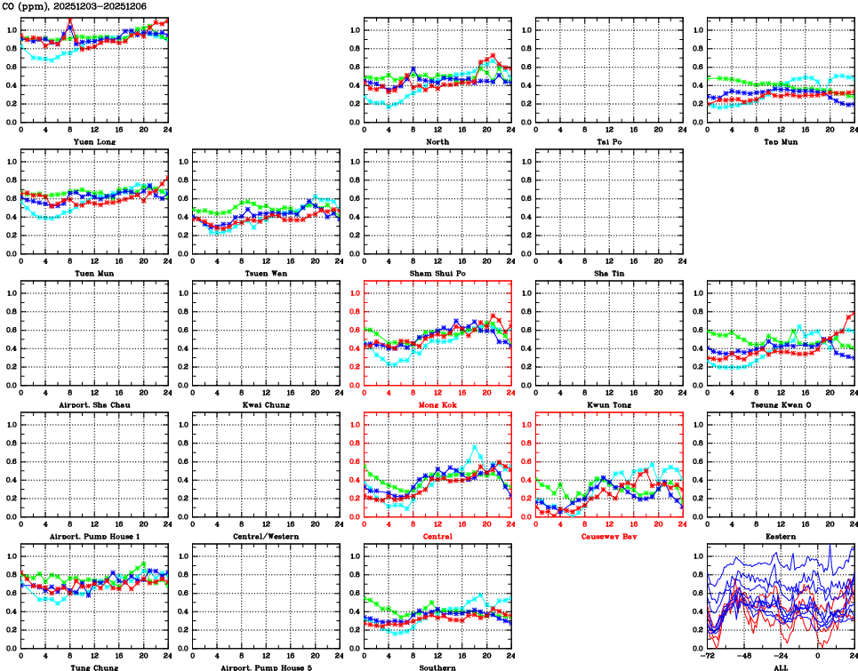 | Air Quality Data Time Series for CO (2025/12/06) | ( Line colors: Day -3 Day -2 Day -1 Current day ) | 2D Map Current AQHI |