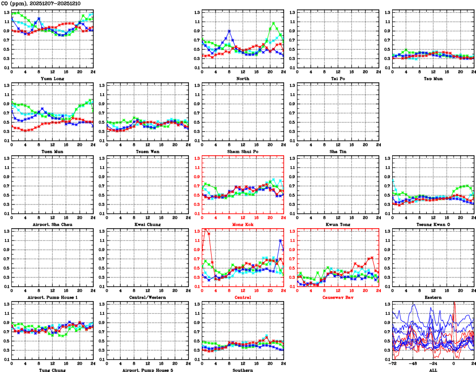 | Air Quality Data Time Series for CO (2025/12/10) | ( Line colors: Day -3 Day -2 Day -1 Current day ) | 2D Map Current AQHI |
