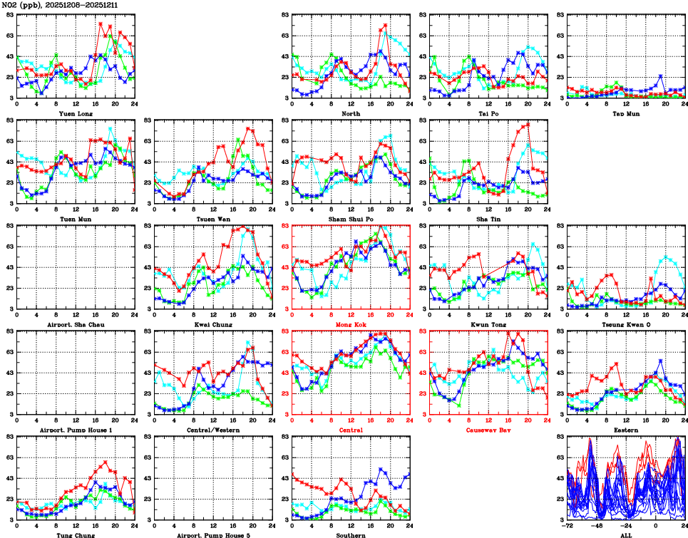 | Air Quality Data Time Series for NO2 (2025/12/11) | ( Line colors: Day -3 Day -2 Day -1 Current day ) | 2D Map Current AQHI |