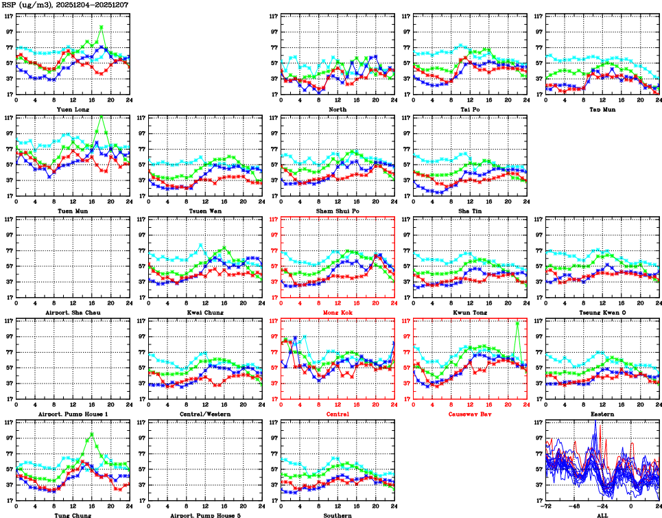 | Air Quality Data Time Series for RSP (2025/12/07) | ( Line colors: Day -3 Day -2 Day -1 Current day ) | 2D Map Current AQHI |