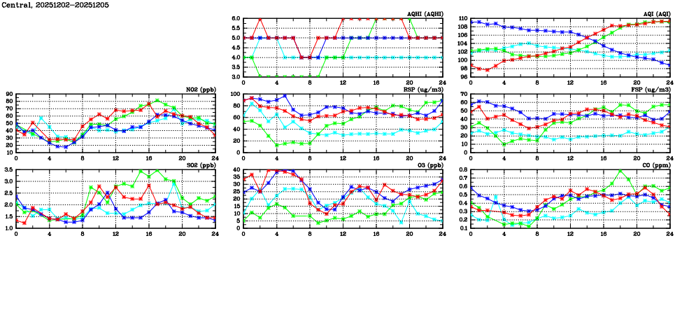 | Air Quality Data Time Series in Central (2025/12/05) | ( Line colors: Day -3 Day -2 Day -1 Current day ) | 2D Map Current AQHI |