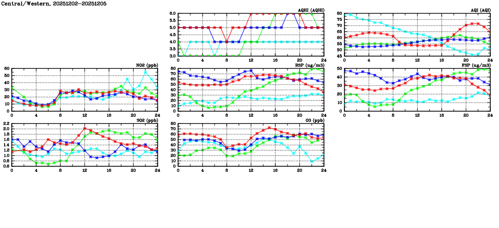 | Air Quality Data Time Series in Central/Western (2025/12/05) | ( Line colors: Day -3 Day -2 Day -1 Current day ) | 2D Map Current AQHI |