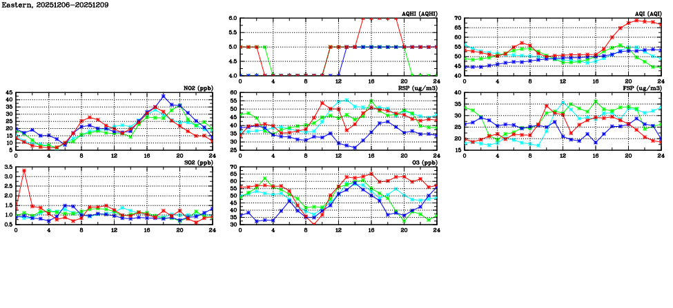 | Air Quality Data Time Series in Eastern (2025/12/09) | ( Line colors: Day -3 Day -2 Day -1 Current day ) | 2D Map Current AQHI |