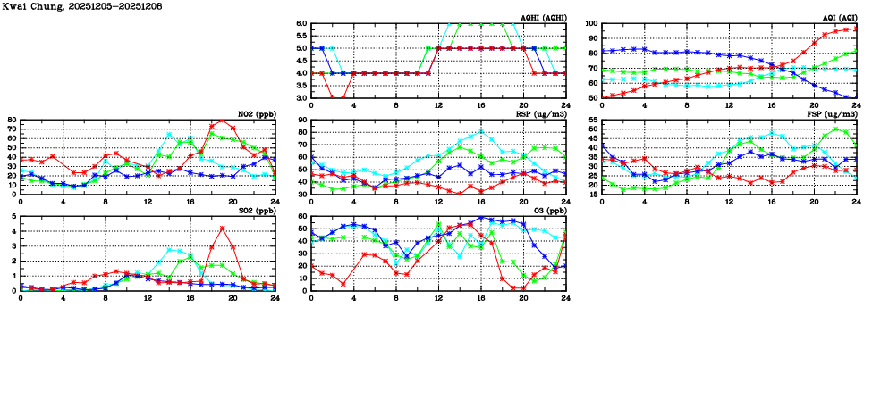 | Air Quality Data Time Series in Kwai Chung (2025/12/08) | ( Line colors: Day -3 Day -2 Day -1 Current day ) | 2D Map Current AQHI |